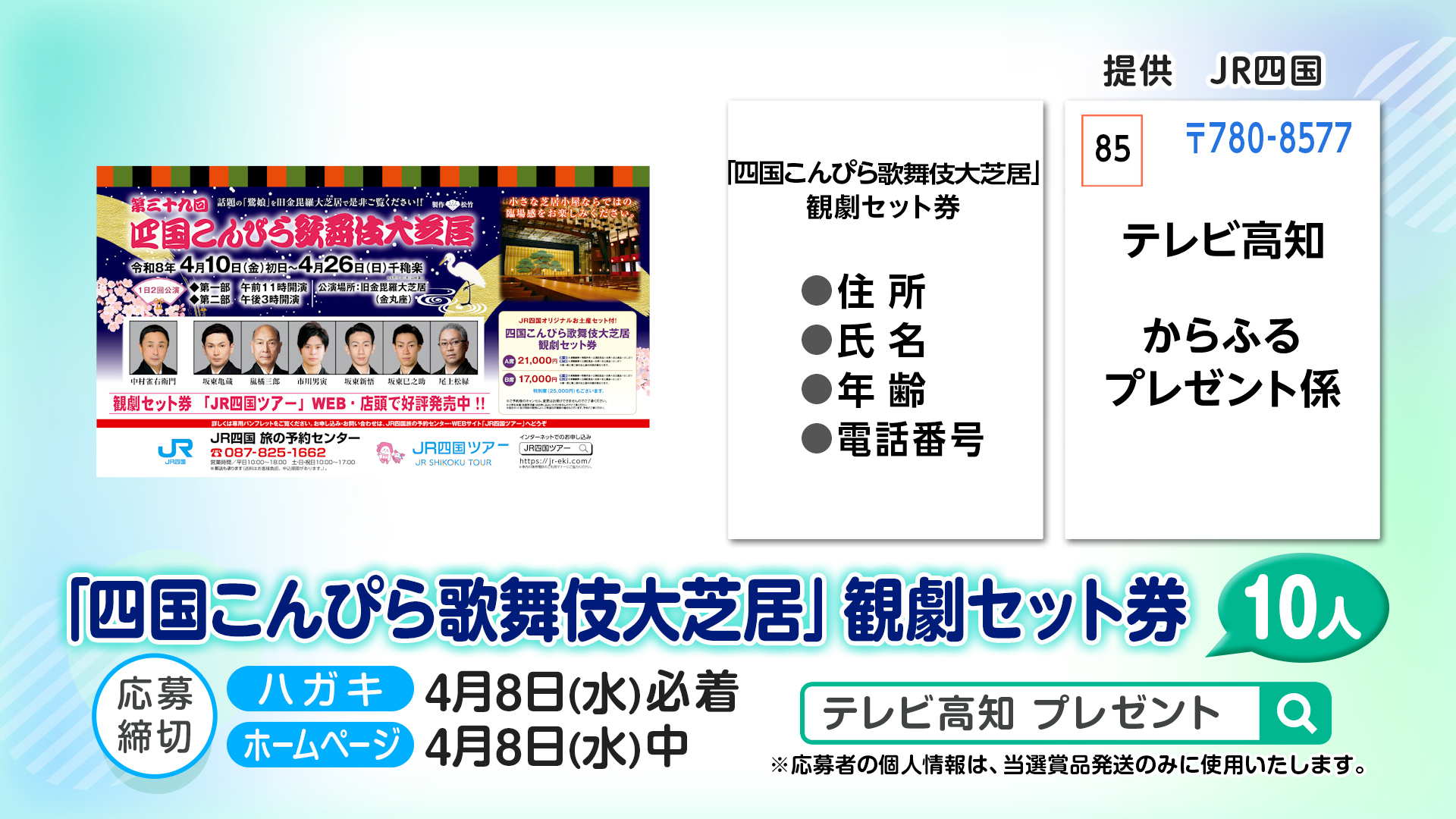 ■プレゼント名 「四国こんぴら歌舞伎大芝居」観劇セット券 とご記入ください〒780-8577